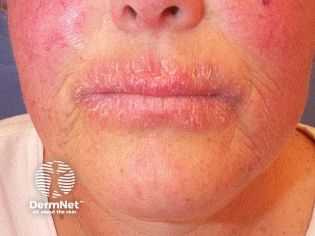 A dry, windy or cold climate tends to dry everyone's lips. The dryness gets worse during mouth breathing because of rhinitis, sinusitis or upper respiratory tract infection. When soothed by saliva, dryness soon progresses to contact irritant dermatitis that extends onto surrounding skin. The patient often denies licking their lips – they may wet them unconsciously, or repeatedly touch, roll and squeeze them. Resultant fissures may take weeks to heal and are prone to secondary infection. Stinging and irritation may also arise from contact with citrus fruit (acidic) or spicy foods (chilli).