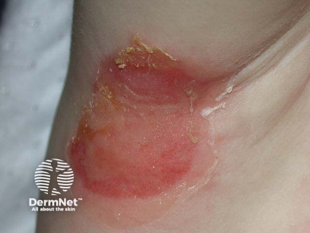 The rash affects the face, trunk, flexures or extremities. It starts as small vesicles that rapidly enlarge into flaccid bullae; surrounding skin appears normal. These may rupture; leaving shiny erosions that soon dry up. The affected child usually has no systemic symptoms.