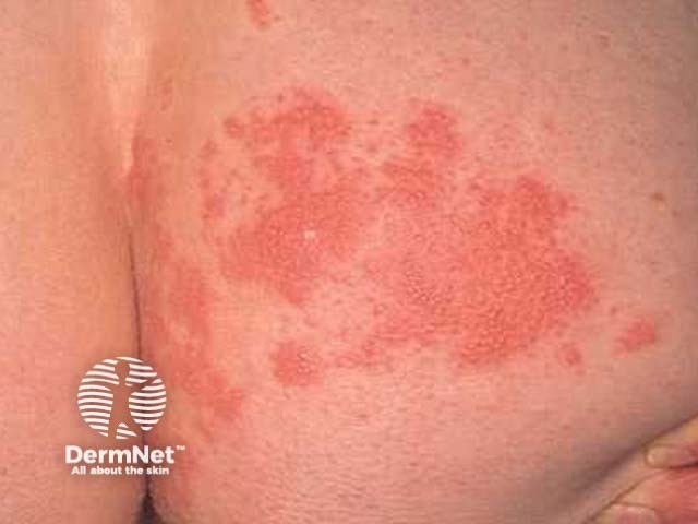 She has Herpes zoster. The presentation of localised pain, malaise and rash is characteristic, but is surprisingly often misdiagnosed. There are small grouped vesicles on an inflamed base in a dermatomal distribution.