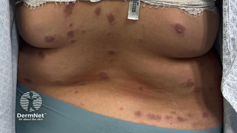 On examination, she had multiple dark red plaques with a rim of brownish hues over the back, buttock, thighs, and lower legs. They were mildly indurated on palpation. She did not have lymphadenopathy or organomegaly.
