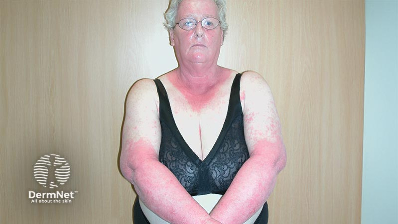This 70-year-old lady has developed an itchy eruption on her forearms, neck, and face. She has arthritis.