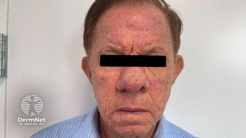 A 77-year-old male presented with facial redness and discomfort for the past year.