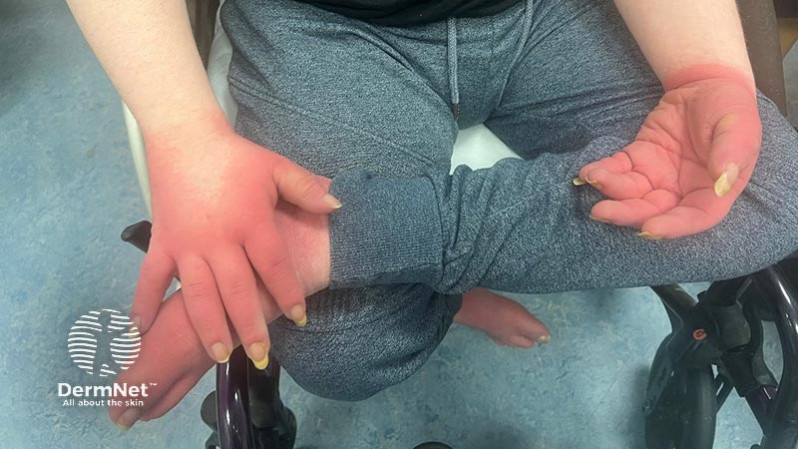 This young gentleman presented to the emergency department with a new onset red-hot and painful rash on his hands and feet. The rash was clearly demarcated, as shown in the clinical photographs. He described some preceding non-specific viral symptoms.