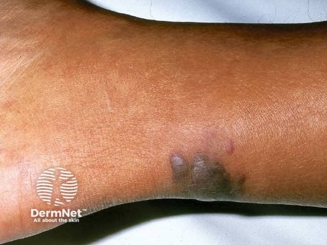 Angiokeratoma is usually diagnosed clinically on the typical appearance but can be confirmed on dermoscopy and skin biopsy [see Angiokeratoma pathology].