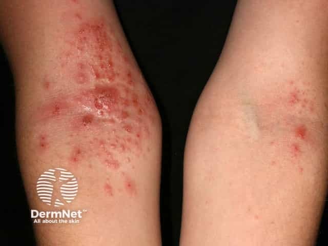 Bilateral erythema, scale and excoriation in atopic limb eczema