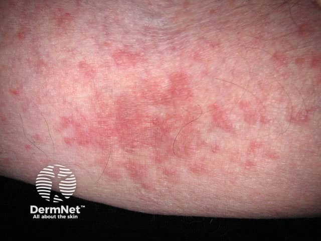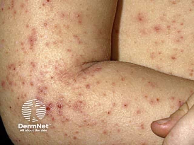 Close-up of erythematous papules and scratch marks in lichenified atopic dermatitis