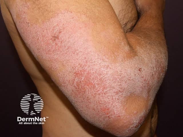 Lichenified and excoriated chronic eczema on the elbow