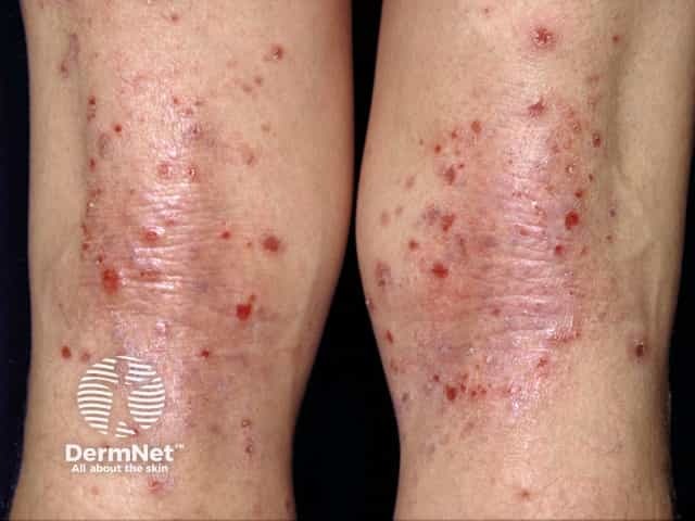 Excoriated acute eczema on the extensor aspects of the knees (reverse pattern)