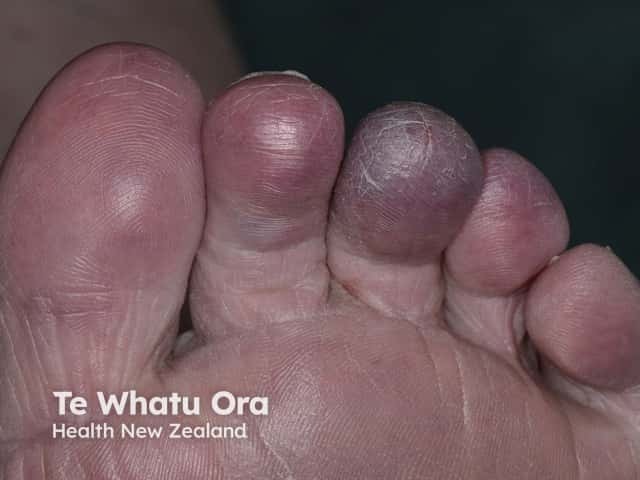Cutaneous abnormalities are usually one of the earliest symptoms; most commonly, blue or purple discolouration of the affected toes [9]. Discolouration may affect one foot or both, depending on the underlying pathophysiology. It is often painful and may be associated with claudication.