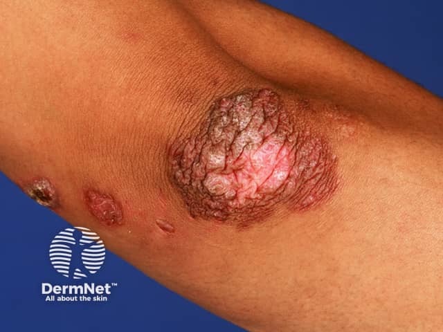 Metastatic tuberculous abscess (tuberculous gumma) is also due to haematogenous spread to the skin in children and immunocompromised adults, but presents as a subcutaneous nodule or cold abscess on an extremity. The overlying skin breaks down to form an ulcer with sinus tracts and fistulae.