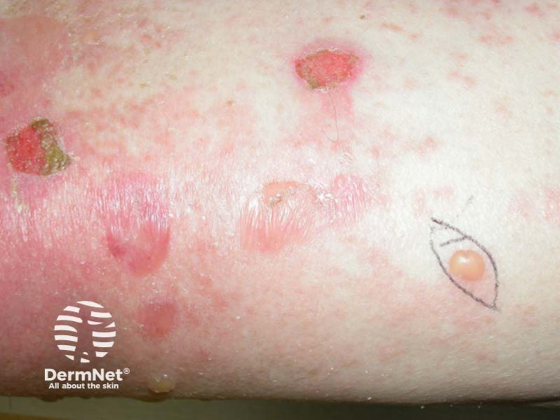 This elderly lady has been experiencing generalised itch for two months and, more recently, has developed lesions on her legs. She has type 2 diabetes mellitus and takes an oral agent to control this.