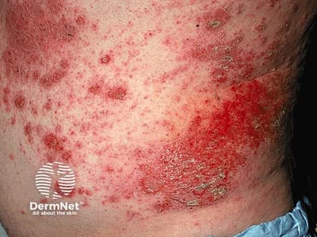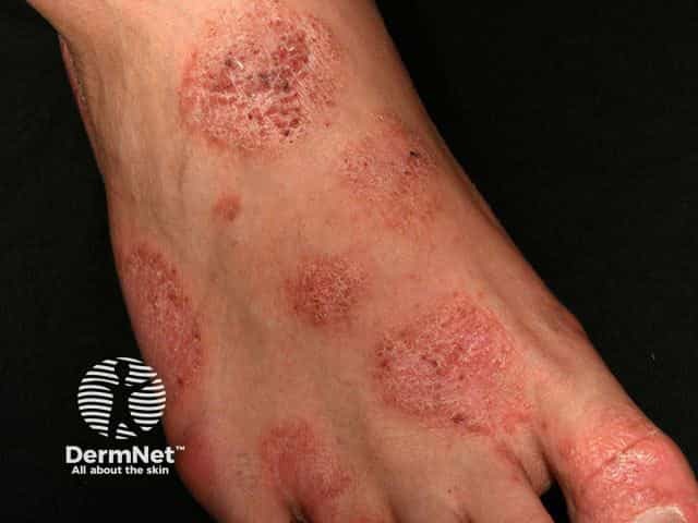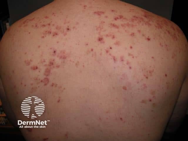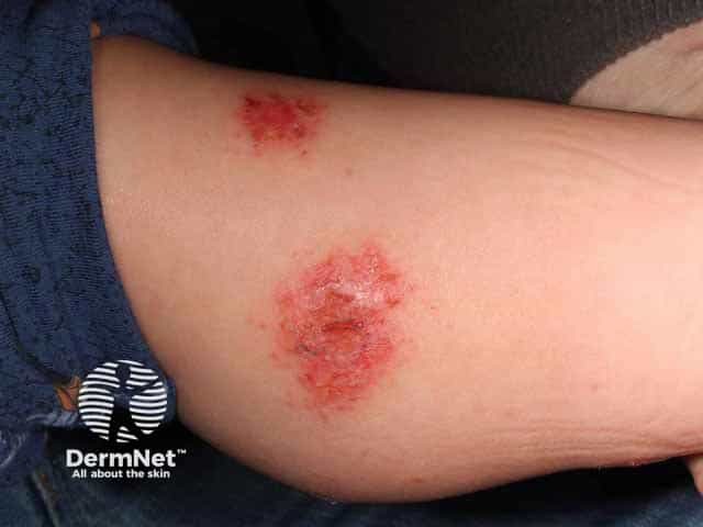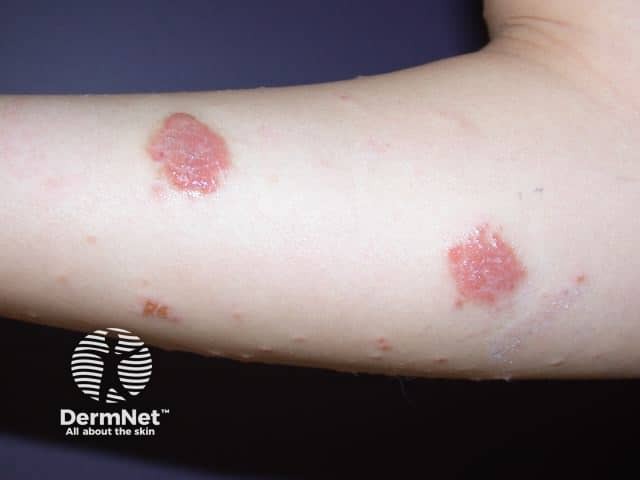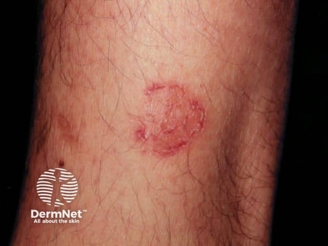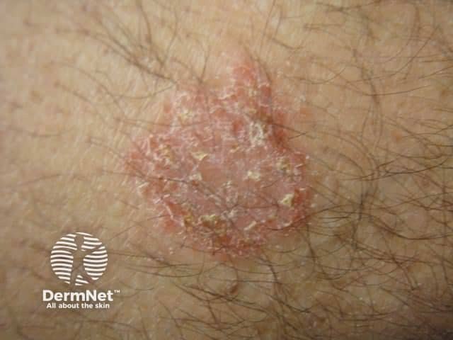 Scaling and hyperpigmentation from discoid eczema (NP-patient3)