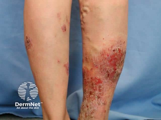 Scattered patches of discoid eczema on the legs (ND-patient1)