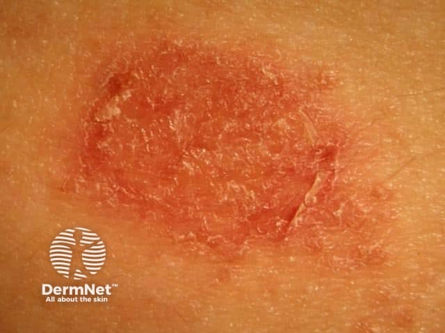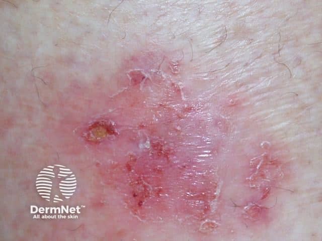 An oozing and fissured discoid eczema plaque (ND-patient1)