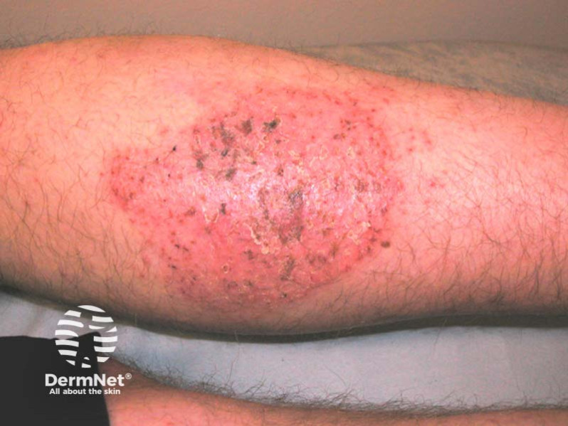 This boy had atopic eczema when he was younger. He has now got an itchy, weeping area on his medial calf and shin. Treatment with oral flucloxacillin has only partially helped.