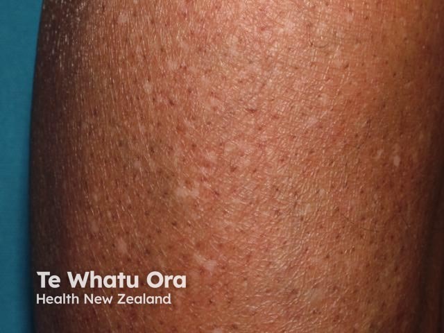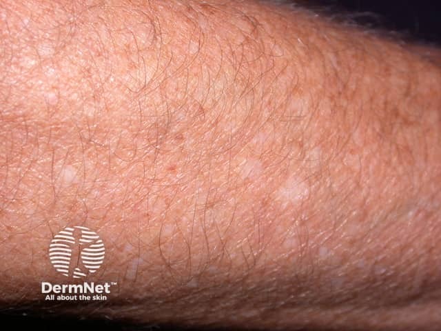 Idiopathic guttate hypomelanosis typically presents as smooth pale (hypopigmented) or white (depigmented) macules 2–5mm (range up to 1.5cm) in diameter most commonly on the sun-exposed aspects of the forearms, shins, and V of chest. Lesions are usually multiple and asymptomatic.