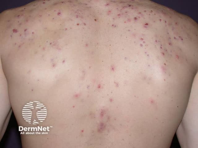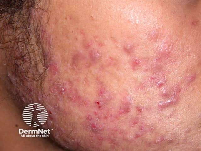 Inflammatory lesions in acne include small red bumps (papules), pustules, large red bumps (nodules) and pseudocysts (these are fluctuant nodules). Inflammatory acne lesions are often painful.