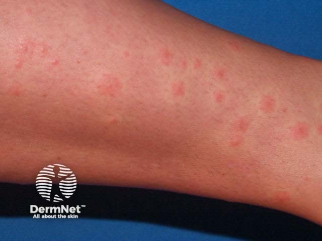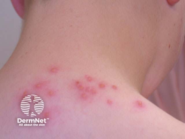 Papular urticaria describes clusters of irritable urticated papules, most often due to bites by mosquitoes, sandflies, fleas. mites or sometimes bed bugs. Each spot is erythematous but may have a pale centre, and elevated (urticated). There is often a central punctum at the site of penetration of the insect bite or sting and a vesicle may appear. Lines of bites are characteristic. A few individuals may have bullous lesions, especially tourists exposed to new insects. Older lesions tend to be excoriated firm papules with scabs and crusts.