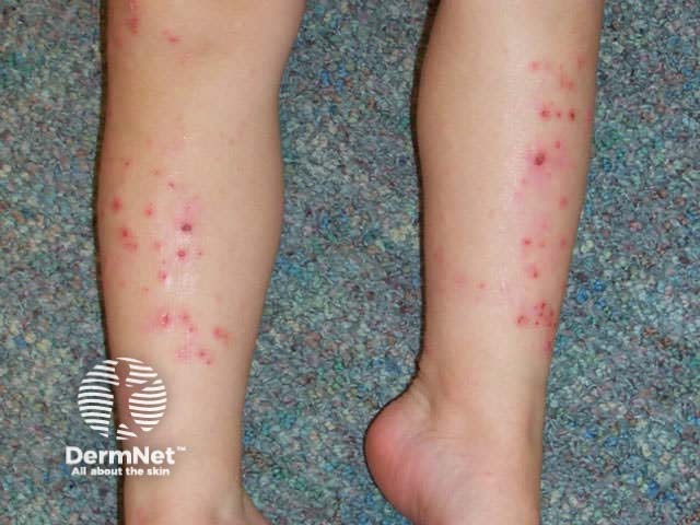 Children with papular urticaria may present with numerous lesions on exposed areas, particularly the lower legs but also arms, cheeks and waistline. Papules may persist for weeks, and older lesions may reappear with new crops presumably in response to new bites. Postinflammatory hypo- or hyperpigmentation and scars are common. The eruption may be seasonal, dying down in mid-winter to reappear in spring for two or three seasons until immune tolerance occurs.