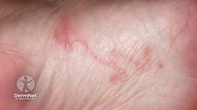This 30-year-old lady has recently returned from a holiday in Thailand. She has developed red itchy lesions on her feet.