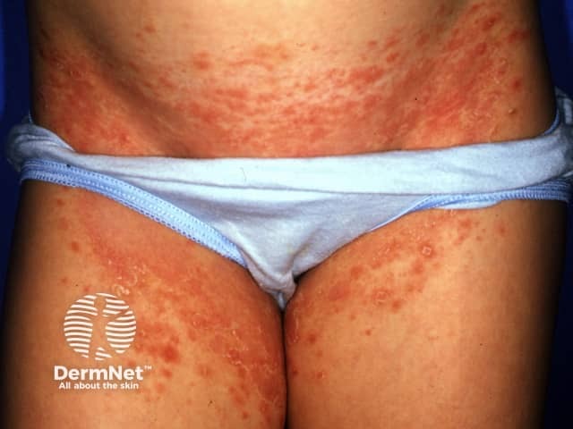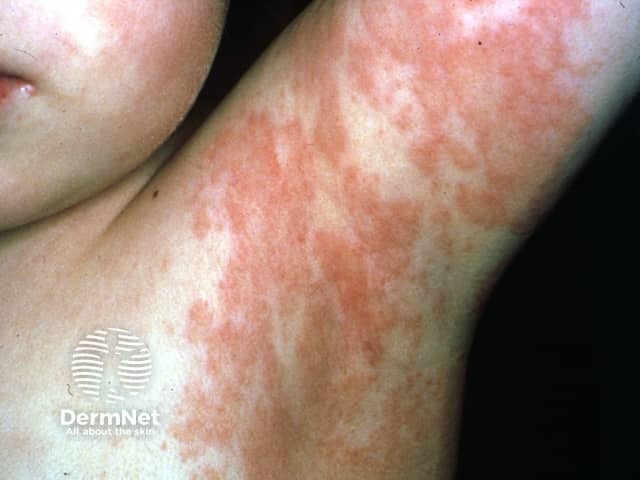 The rash is often mistaken for eczema (dermatitis) or a fungal infection (ringworm). It usually starts in the armpit or groin and gradually extends outwards, remaining predominantly on one side of the body. It may spread to the face, genitalia, hands, or feet.