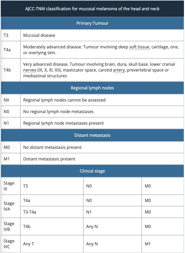 The American Joint Committee on Cancer (AJCC) Tumour, Node, and Metastasis (TNM) classification is used to stage mucosal melanoma of the head and neck. Mucosal tumour staging begins at T3 (advanced). Like cutaneous melanoma, mucosal melanoma can also spread to lymph nodes or through the blood stream to other areas of the body. Here, they can form new tumours. These are referred to as metastases.