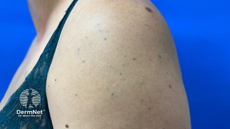 A 51-year-old Tongan woman with a background of chronic plaque psoriasis controlled on 20 mg weekly of methotrexate, presented for a routine review and was noted to have multiple asymptomatic blue-black macules and papules scattered on her face, forearms, trunk, and feet. She reported having had a couple of these lesions for years before a marked increase in number following a serious infection of SARS-CoV-2 (COVID-19) a year prior to her presentation. Dermoscopy of a representative lesion is shown.