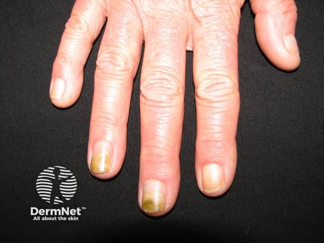 Onychomycosis showing pigmentation of the plate and subungal hyperkeratosis (ONYC-patient6)