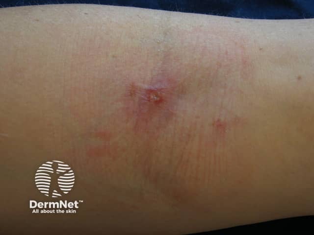 In the skin pathergy test, multiple pricks are made into the forearm, using a sterile needle. The pricked area is observed over the next few days. Positive pathergy tests are present if any of the following are observed at the site of the needle prick.