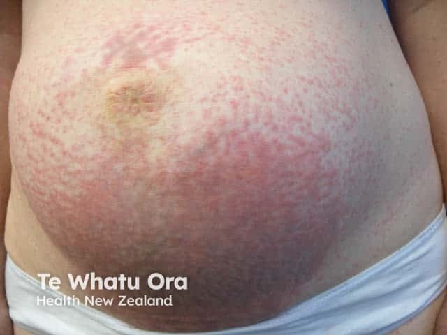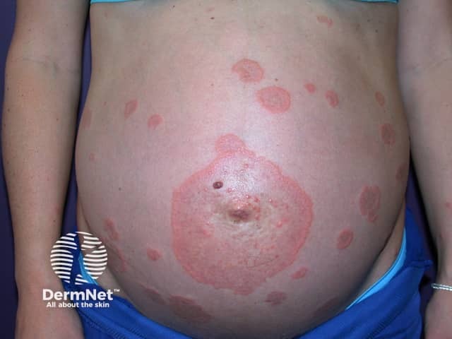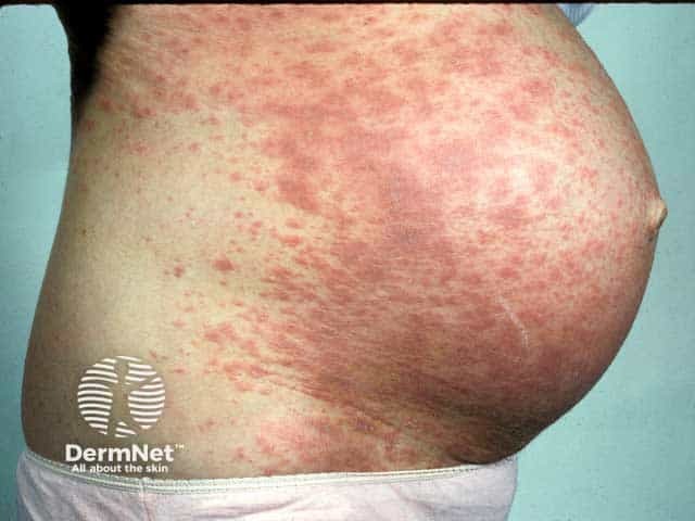 Pemphigoid gestationis typically presents as an intensely itchy urticaria-like rash during mid to late pregnancy (13–40 weeks gestation).
