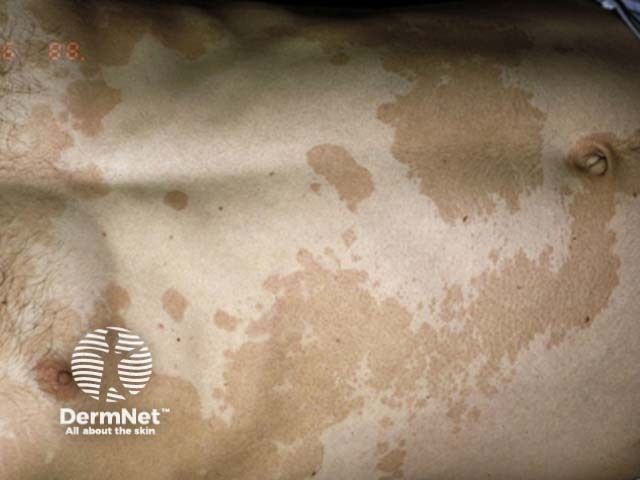 Pityriasis versicolor is a common yeast infection of the skin, in which flaky discoloured patches appear on the chest and back.