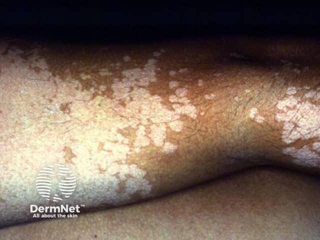Pityriasis versicolor affects the trunk, neck, and/or arms, and is uncommon on other parts of the body. The patches may be coppery brown, paler than surrounding skin, or pink. Pale patches may be more common in darker skin; this appearance is known as pityriasis versicolor alba. Sometimes the patches start scaly and brown, and then resolve through a non-scaly and white stage.