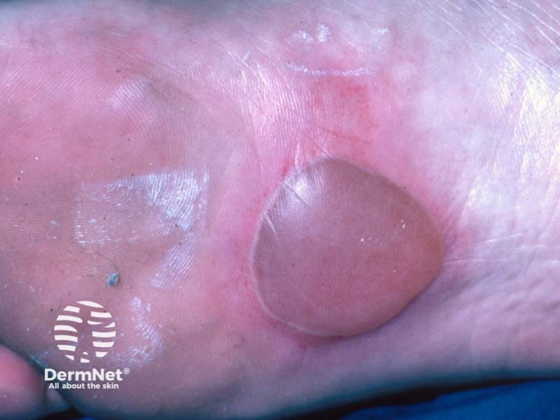 This 45-year-old lady has recurrent urinary tract infections; every time she gets one, she develops an inflamed lesion in the same place on her left sole. On the last occasion, she developed a blister.
