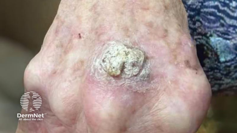On examination, she had a solitary hard raised lesion on the dorsal hand with significant hyperkeratosis. There was no bleeding or ulceration.