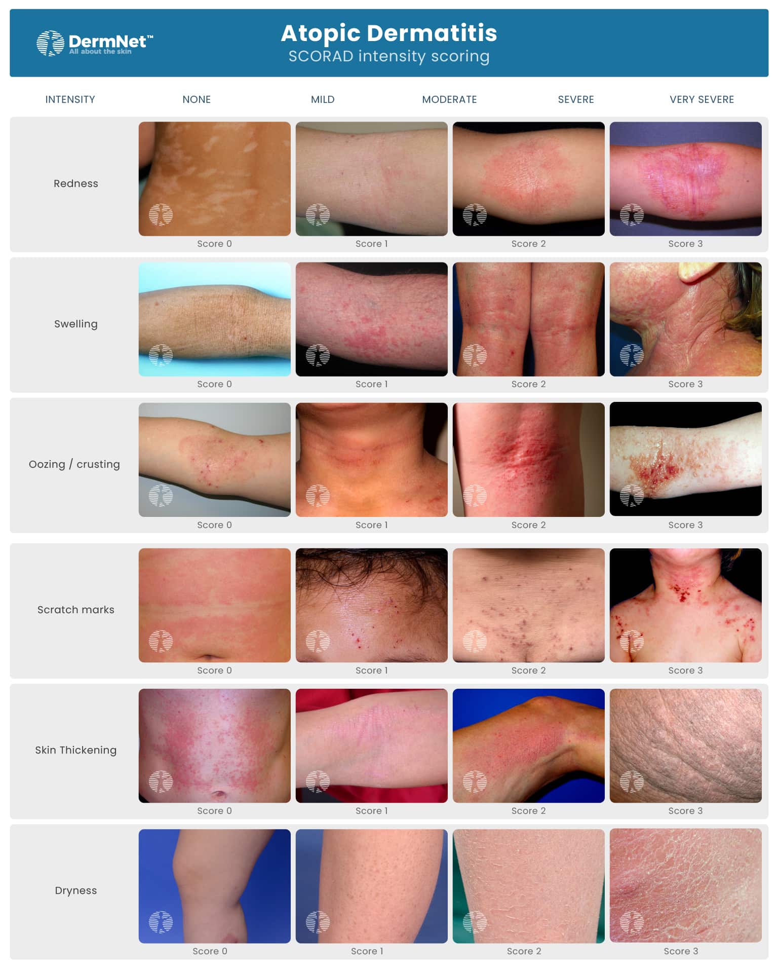 SCORAD is a clinical tool used to assess the extent and severity of eczema (SCORing Atopic Dermatitis). Dermatologists may use this tool before and after treatment to determine whether the treatment has been effective.