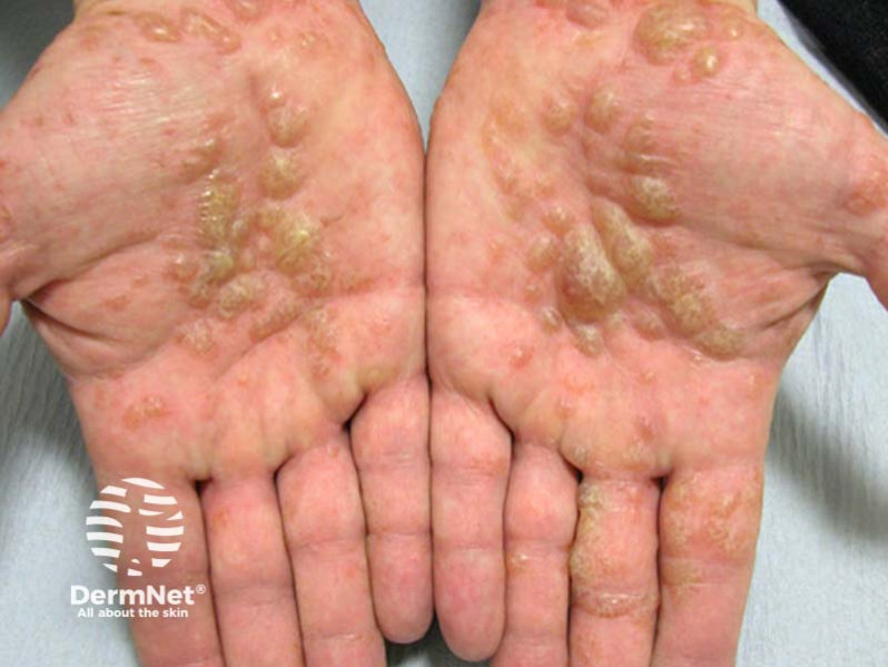 This 53-year-old man has had recurrent blistering on the palms of his hands. It occurs three or four times a year, particularly when the weather changes from cool to warm.