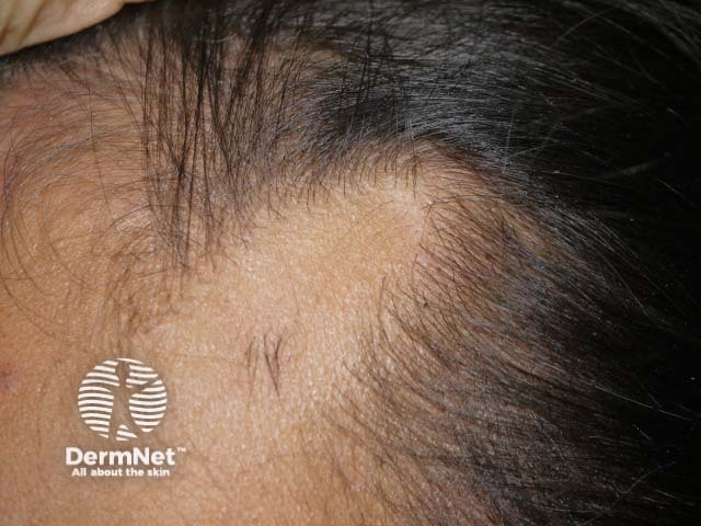 Temporal triangular alopecia appears as a triangular or spear-shaped loss of hair, with the ‘point’ of the triangle directed up and back. The shape is sometimes round or oval. It usually does not cause any symptoms, but sometimes patients report dysaesthesia in the lesion.