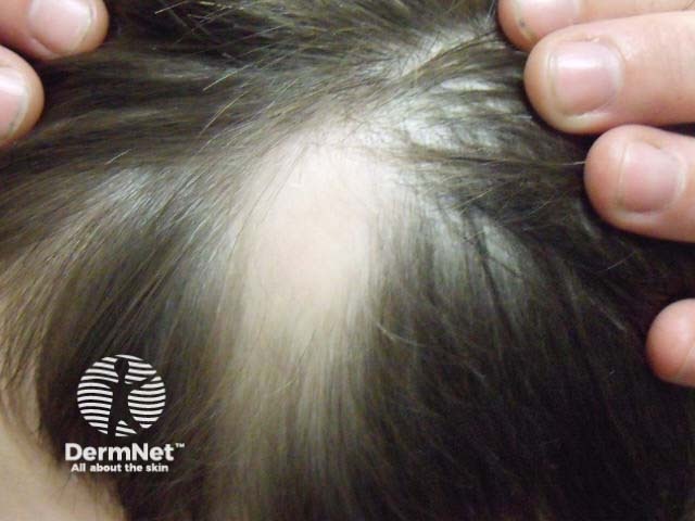 The lesion most commonly appears on the temporal scalp on one side only, although can affect both sides. Involvement of the occipital hairline has also been reported.